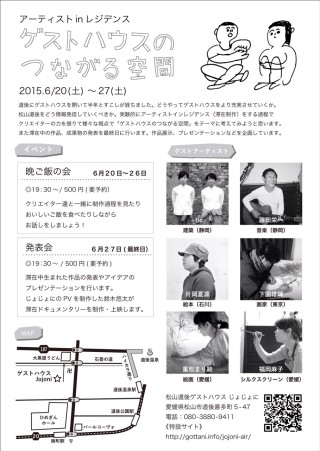 6月のイベント情報 Infomation 2015年05月28日 6月のイベント情報ーーーーーーーーーーーーーーーー『松山ブックマルシェ』開催場所和光会館(旧 和光幼稚園)愛媛県松山市緑町1-2-1開催時間13日:10~17時、14日:10~16時古本が1万冊も集まるビックイベント!私は"手仕事屋 重黒"という屋号で絵描きのKshaMiさんと一緒に出店します。砥部焼で作った小物を中心に手作り雑貨を出品いたします。ーーーーーーーーーーーーーーーー6/20(土)〜27(土)アーティストインレジデンスinじょじょに『ゲストハウスのつながる空間』実際にゲストハウスに泊まりながら滞在制作を行います。交流イベントもありますので興味のある方はぜひお越しください。* * * * * *松山道後にあるゲストハウス「じょじょに」にて、様々な分野で活躍する県内外のアーティストを集い、地域との交流も深めながら"ゲストハウスのつながる空間"をテーマに作品制作を行います。土地や場所に根ざした表現方法を探り、刺激的なアートの創生を目的としています。場所:ゲストハウスじょじょに〈愛媛県松山市道後喜多町5-47〉『ゲストハウスのつながる空間』イベントページ