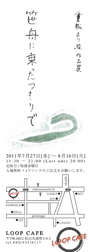report「笹舟に乗ったつもりで」 report 2011年09月01日 2回目の個展は松山のLOOP CAFEでした。チョコバナナミルク、おいしい!ネギトロのラー油丼、お、おいしい!!!愛媛での初の御披露目、小中学生からの友人にも見に来てもらうことが出来ました。笹舟に乗って旅している間に一瞬目が合った景色。その時の感覚を忘れないように描いたような。そんなこんなでつけた展覧会名でした。雰囲気にとけ込んで、座った人とふと目が合っていたならいいな。カフェは、お昼ご飯を食べたリだとか、くつろぐつもりで人が来るので、絵を見にきた訳ではない人の目にもとまるってところがすごく良い。もちろん壁に絵がかかっていることなど気にもしないで帰っていく人もいましたが、見るか見ないかさえもゆだねることが出来るって言うのは少し気が楽でした。展覧会後もひとつ、ソファーの席の場所にかけていた作品をそのまま飾って下さることになりました!あんな良い場所に常設;;うれし涙。見逃したという方もいつでも置いてあるので是非見に来て下さい。(他の方の個展の場合ははずしています。)さりげなく置いていた感想ノートは宝です。たくさんありがとうございました!うっかり様子を写真に撮るのをわすれていたので写真なしのレポートでした。