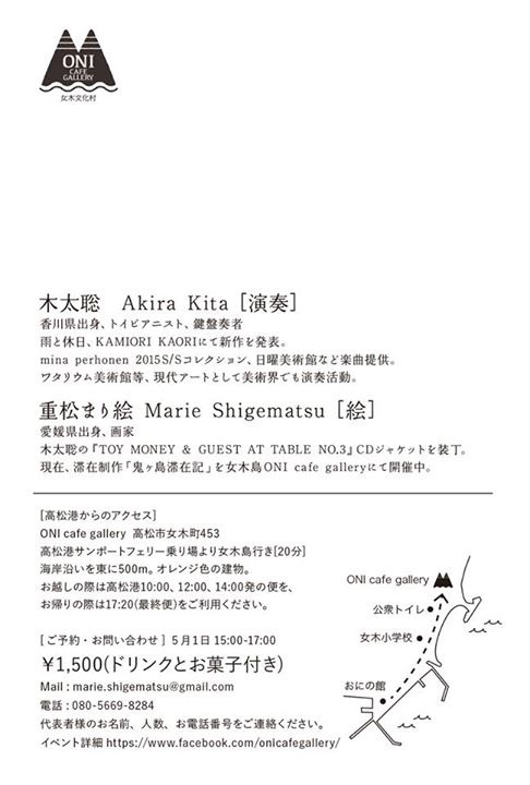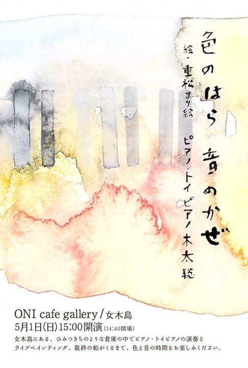 5/1 絵と演奏「色のはら 音のかぜ」 Diary 2016年04月11日 重松まり絵『鬼ヶ島滞在記』企画絵と演奏「色のはら 音のかぜ」絵(live paintitg) / 重松まり絵ピアノ トイピアノ演奏(piano,toy piano) / 木太聡2016年5月1日(日)15:00〜※開場は開演の20分前1500yen(ドリンクとお菓子付き)香川県高松市女木町453女木文化村ONIcafe gallery(女木島)●高松港からのアクセス高松港サンポートフェリー乗り場より女木島行き[20分]海岸沿いを東に500m。オレンジ色の建物。お越しの際は高松港10:00,12:00,14:00発の便を、お帰りの際は17:20(最終便)をご利用ください。【ご予約・お問い合わせ】MAIL:marie.shigematsu@gmail.comTEL:080-5669-8284代表者様のお名前、人数、お電話番号を明記の上ご連絡ください。女木島にあるひみつきちのような倉庫の中でピアノ・トイピアノの演奏とライブペインティング。最終の船がくるまで色と音の時間をお楽しみください。 木太聡 Akira Kita[演奏]香川県出身、トイピアニスト、鍵盤奏者雨と休日、KAMIORI KAORIにて新作を発表。mina perhonen 2015S/Sコレクション、日曜美術館など楽曲提供。ワタリウム美術館等、現代アートとして美術界でも演奏活動。重松まり絵 Marie Shigematsu[絵]愛媛県出身、画家木太聡の『TOY MONEY & A GUEST AT TABLE NO.3』CDジャケットを装丁。現在、滞在制作「鬼ヶ島滞在記」を女木島ONIcafe galleryにて開催中。ドリンク/カネミ農園(興居島)愛媛県松山市の興居島という島で、ご家族でみかんや伊予柑などの柑橘を育てている農家さんにご協力いただき、100%果汁のジュースをお出しします。お菓子/ツムギヤ(大島)愛媛県のしまなみに浮かぶ島、大島で、完全オーダー制のお菓子を作っているツムギヤさん。クッキーやケーキなどを作ってくださいます。 PR