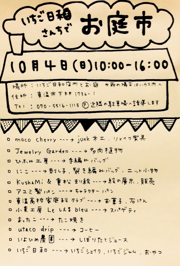 10/4(日)いちご日和さんちでお庭市 Infomation 2015年09月29日 『いちご日和さんちでお庭市』10月4日(日)10:00−16:00東温市下林1736-1再び絵描きのKshaMiちゃんとともに『手仕事 重黒』での出店です!私は新作の砥部焼小物や手ぬぐい秋バージョン、そしてジャケットの絵を描かせていただいた木太聡さんのCDを販売します。今回は重黒で会場の飾り付けや、前日からいちご日和さんのお店に泊まり込みトイレの壁に絵を描いたりもします!そちらもぜひ見ていただけると嬉しいです。素敵な場所なので是非遊びに来てくださいね。 PR