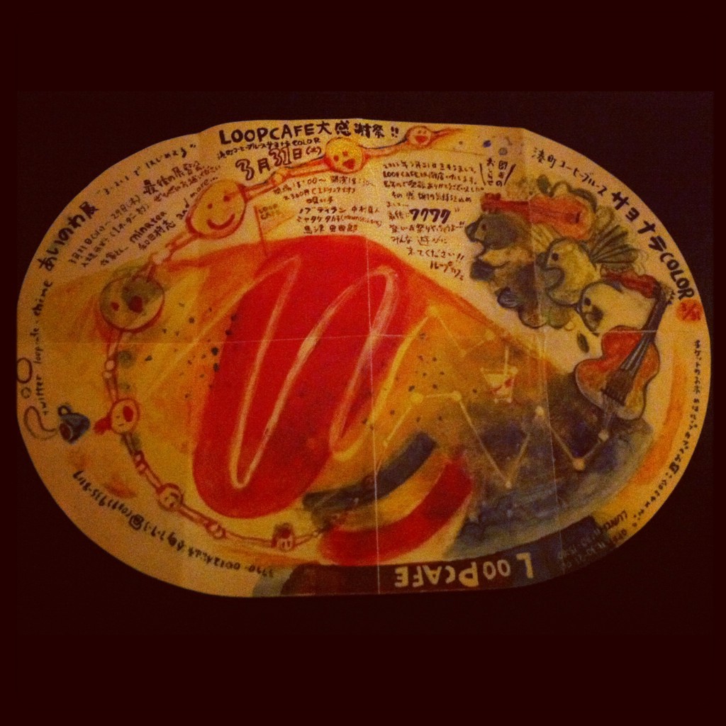今は四月。 Diary 2012年04月13日 大学を卒業し京都から愛媛に帰ってきました。こちらでは風は強いけど太陽がぽかぽか照っているし、嵐になる時はざっと来る。京都の天気はなんだか悩ましいというかつかみきれなかったけれど、こちらは「なるようになれ!」っというような天気です。そんなような気がするのは私の心持ちのせいなのかもしれません。オオ、スカイはブルー!大学でひっそりと行った最後の個展「はらっぱ」は無事に終えることが出来ました。今までお世話何なった人や、初めましての人に見せることが出来て本当に良かった。ありがとうございました。またもや会場風景を撮り忘れてしまったことを悔やみます。車の免許、、、卒業、、、引っ越し、、、。たくさんの試練が詰まった怒濤の3月でしたが、そんな3月の締めくくりとなったのは個展でもお世話になったループカフェの閉店イベントでした。私はイベントのチラシを描かせていただきました。ループのメニュー、大好きなレトロオムライスをイメージしました◎ノブ・ディランさん、中村真人さん、ミヤタケタカキさん、島津田四郎さんによるとっておきのライブ。ループへのありがとうでいっぱい。これからもがんばろうでいっぱい。田四郎さんの唄はとっても愉快でへんてこで気持ちいい!ループの店内は最終日なんだということも忘れてしまうほどいつも通りの優しい空気で、でも万国旗みたいに手作りの旗が飾ってあったりなんかして小さな村のお祭りみたいな雰囲気でした。私の絵も最後までちゃんと、壁にかかっていました。すっかりなじんでいたけれど、またどこか良い場所があるよ。ループカフェありがとう!この記事を書くのに一週間ぐらいかかっていたらもうすっかり春になりました。色んな芽よ、でてきておくれ。